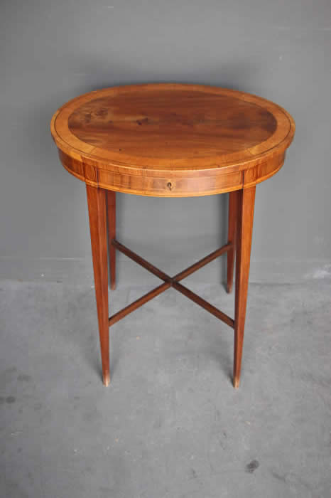 Antique mahogany Georgian period late 18th century drop side lamp table or pembroke table raised on inlaid taper legs legs with a fitted drawer. Polished all round. The solid mahogany top with drop side extensions supported by swing out brackets below . A drawer at one end for convenience with lock and working key and gilt brass ring pull handles. A faux drwer front mirrors the same at the other end of the table. Raised on a traditional taper legs with spade feet in the Sheraton manner. Ideal as a centre table, or lamp table or even as a bedside table. Made in solid Honduras mahogany with satinwood and ebony string inlay and with good french polished patina. Some marks to surface consistent with age and use. .