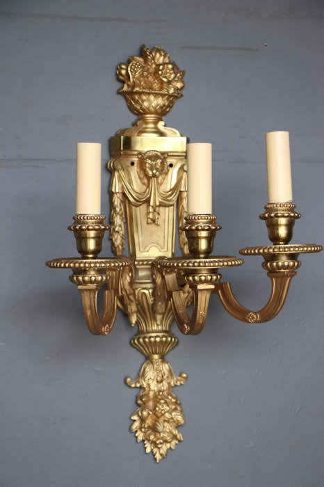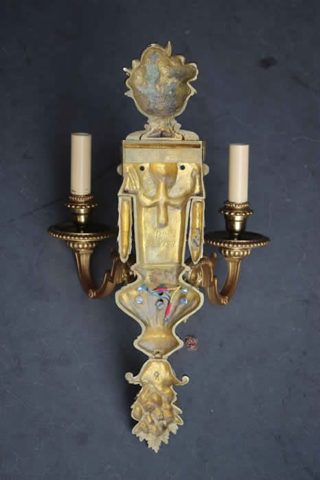 The ornate cast bronze with gilt finish sconces originally for candle power but with later electification with four lamp holders.