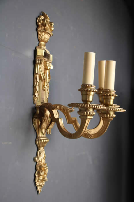 Large antique French Louis XVI gilt bronze wall light 3 arms with